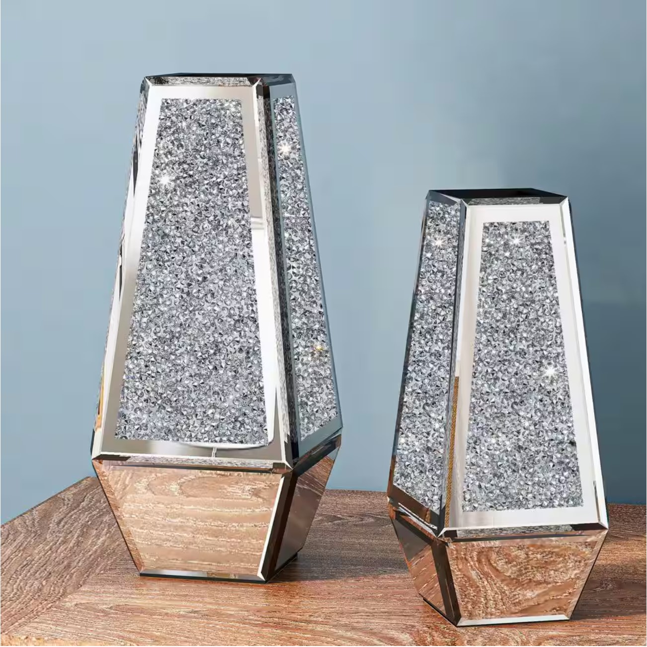 - Embellished with glistening crystals, these vases transcend mere decor, becoming exquisite artistry. Crafted with MDF frames for unwavering stability and wrapped in HD Clear glass, they enchant with a crystalline clarity that turns every floral arrangement into a masterpiece.